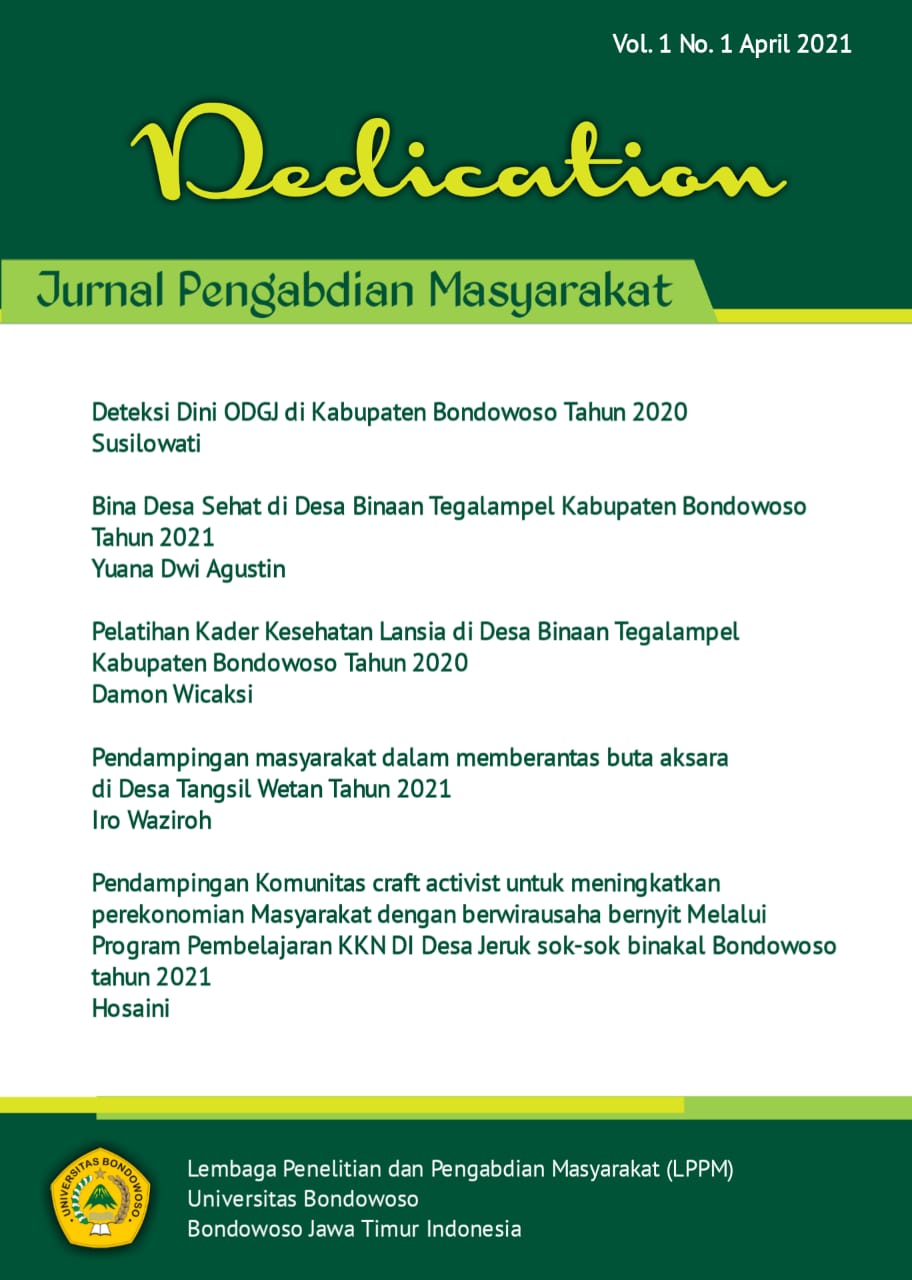 Dedication: Journal of Community Service is a journal that is a media medium for scientific publication in the field of community service, with a list of P-ISSN (2776-2491) and E-ISSN (2776-3021) numbers. Dedication is a scientific multidisciplinary journal as a medium for accommodating the aspirations of lecturers to carry out tridarma activities in the field of service published by the Bondowoso University Research and Community Service Institute (LP2M).