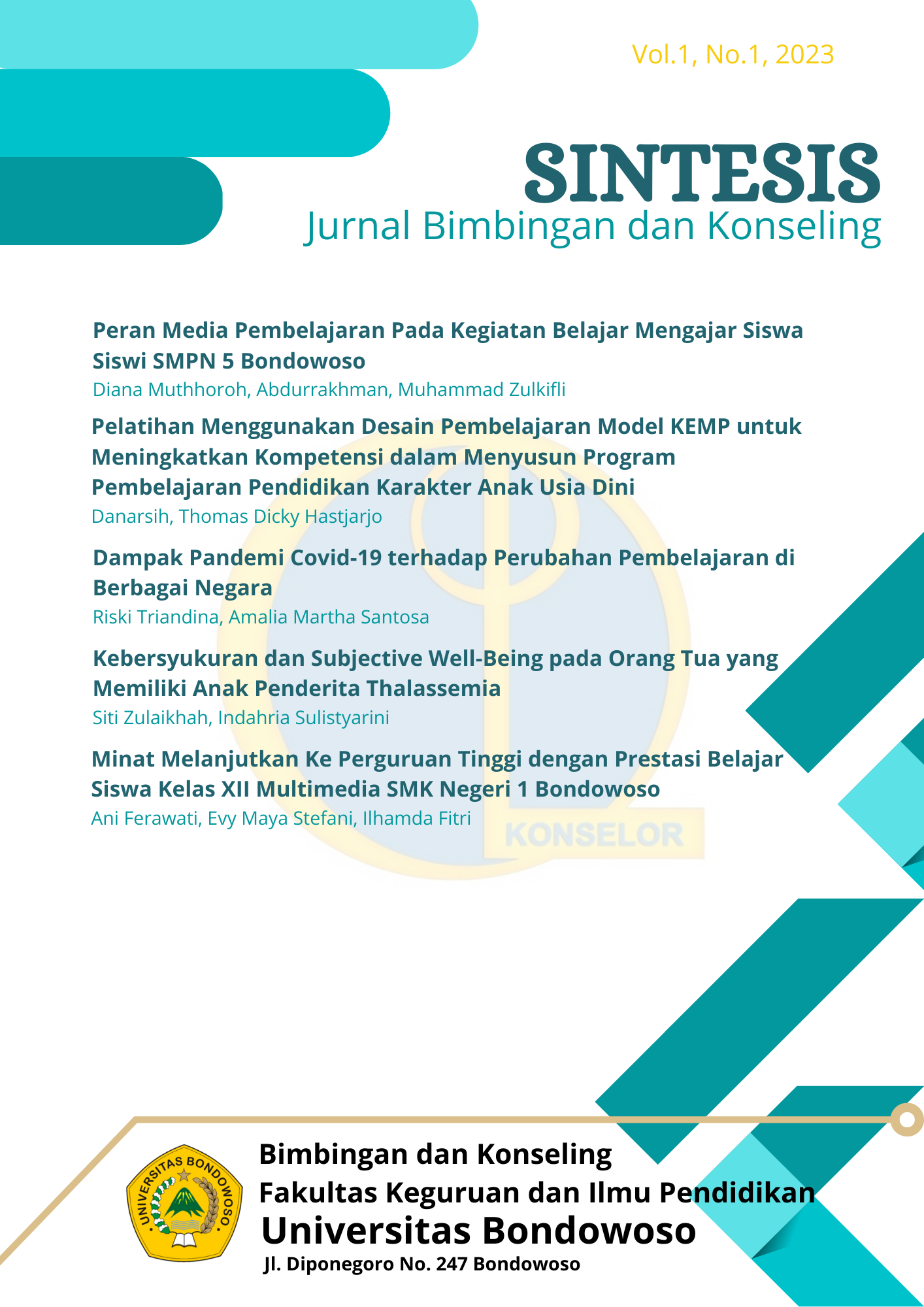 Sintesis: Jurnal Pendidikan Bimbingan dan Konseling, is a scientific journal, which publishes scientific articles of the developments of thinking and research in  Counseling Guidance. This journal is published twice a year, on February and August. Sintesis accepts submissions of articles, which haven’t been published and not in the process of being published in other media. Sintesis is committed to applying publication ethics standard strictly and accountably. Therefore, Sintesis has formulated publication ethics, which must be obeyed the Publisher, Editors, Reviewers, and Authors. In order to make an article published in Sintesis, the author should take some guidelines into account, as show on Author Guidelines. Address: Universitas Bondowoso Jl. Diponegoro No.247, Selatan Sawah, Desa Kota kulon, kecamatan Kota, Kabupaten Bondowoso, Jawa Timur 68219. Telp/Fax. (0332) 427022, e-mail:  bkunibo@gmail.com. Contact: 0852-3611-8983 (Andrielina) and 0858-7148-4161 (Zulaikhah).